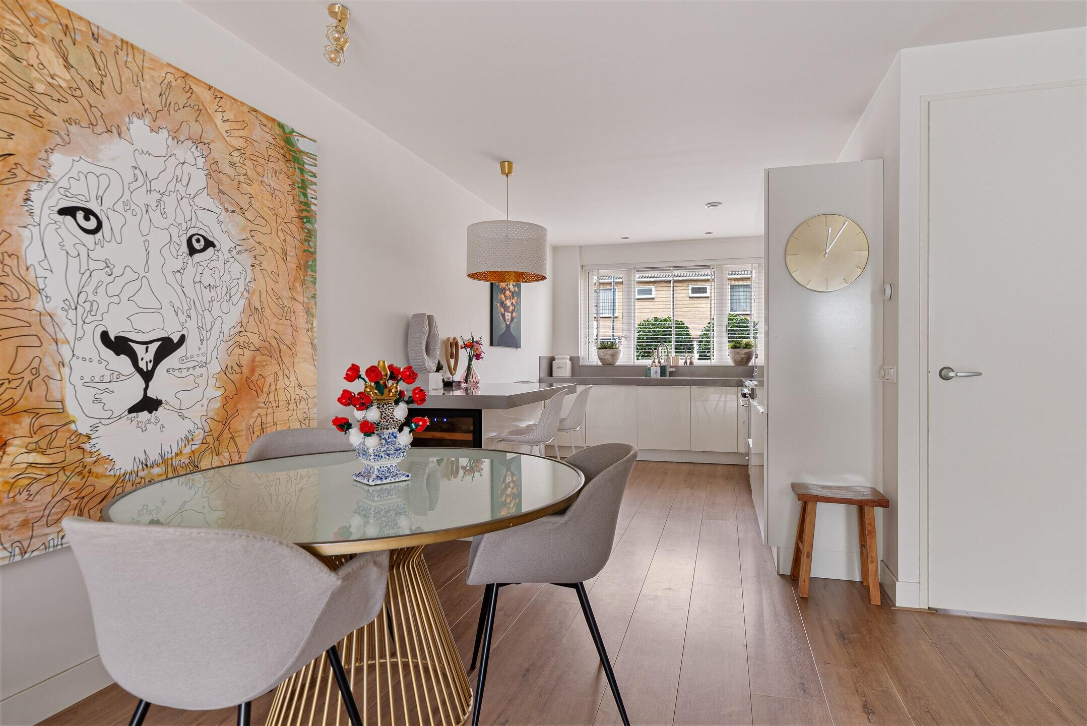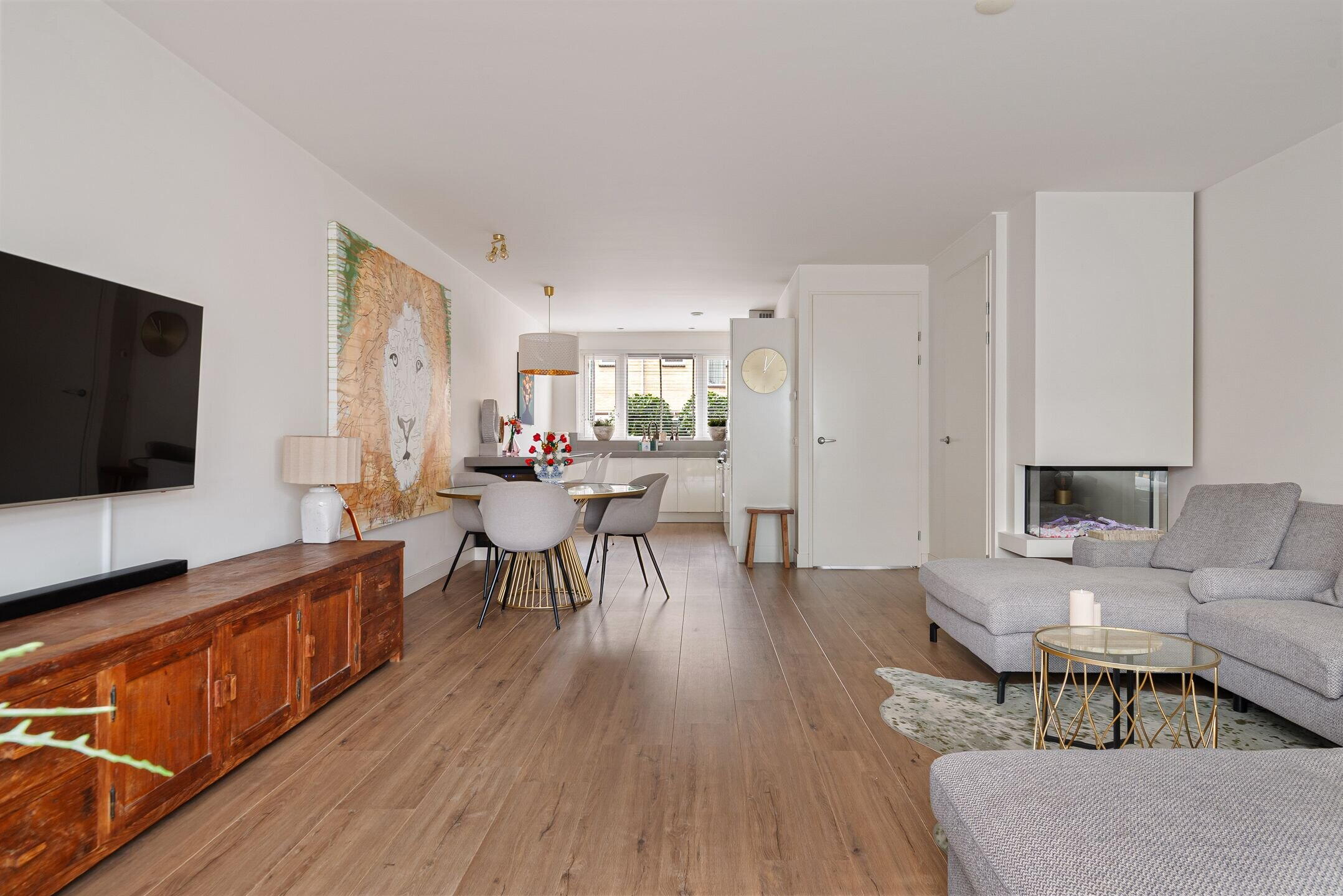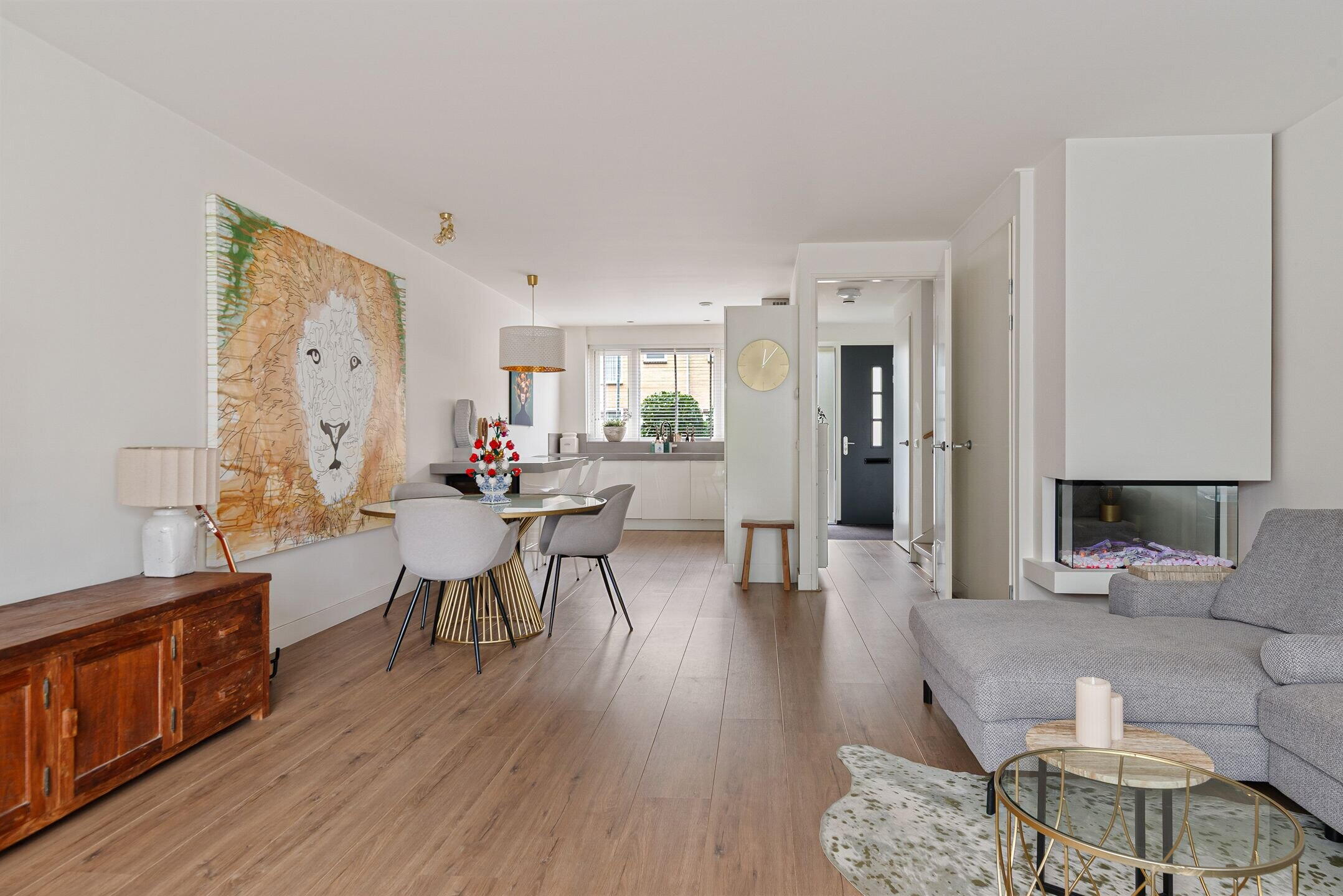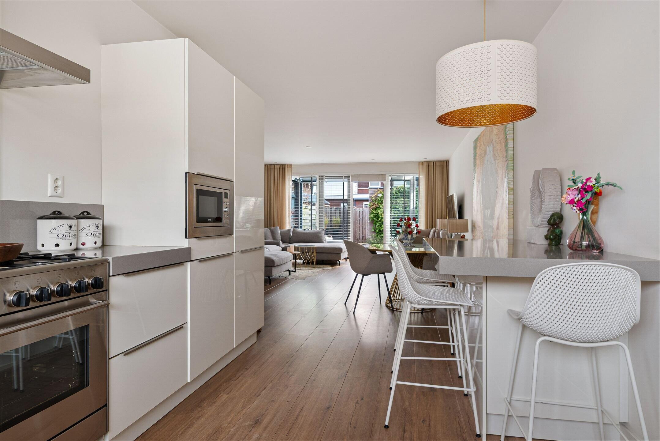 Bij binnenkomst valt direct de verzorgde en moderne afwerking op. De lichte woonkamer biedt een fijne leefruimte met een prettige verbinding naar de tuin. Grote raampartijen zorgen voor veel daglicht en een ruimtelijk gevoel. Aan de voorzijde bevindt zich de luxe keuken, compleet uitgevoerd met moderne inbouwapparatuur en volop werk- en bergruimte – een heerlijke plek voor kookliefhebbers. De begane grond is praktisch ingedeeld en vormt een fijne leefruimte voor het hele gezin.