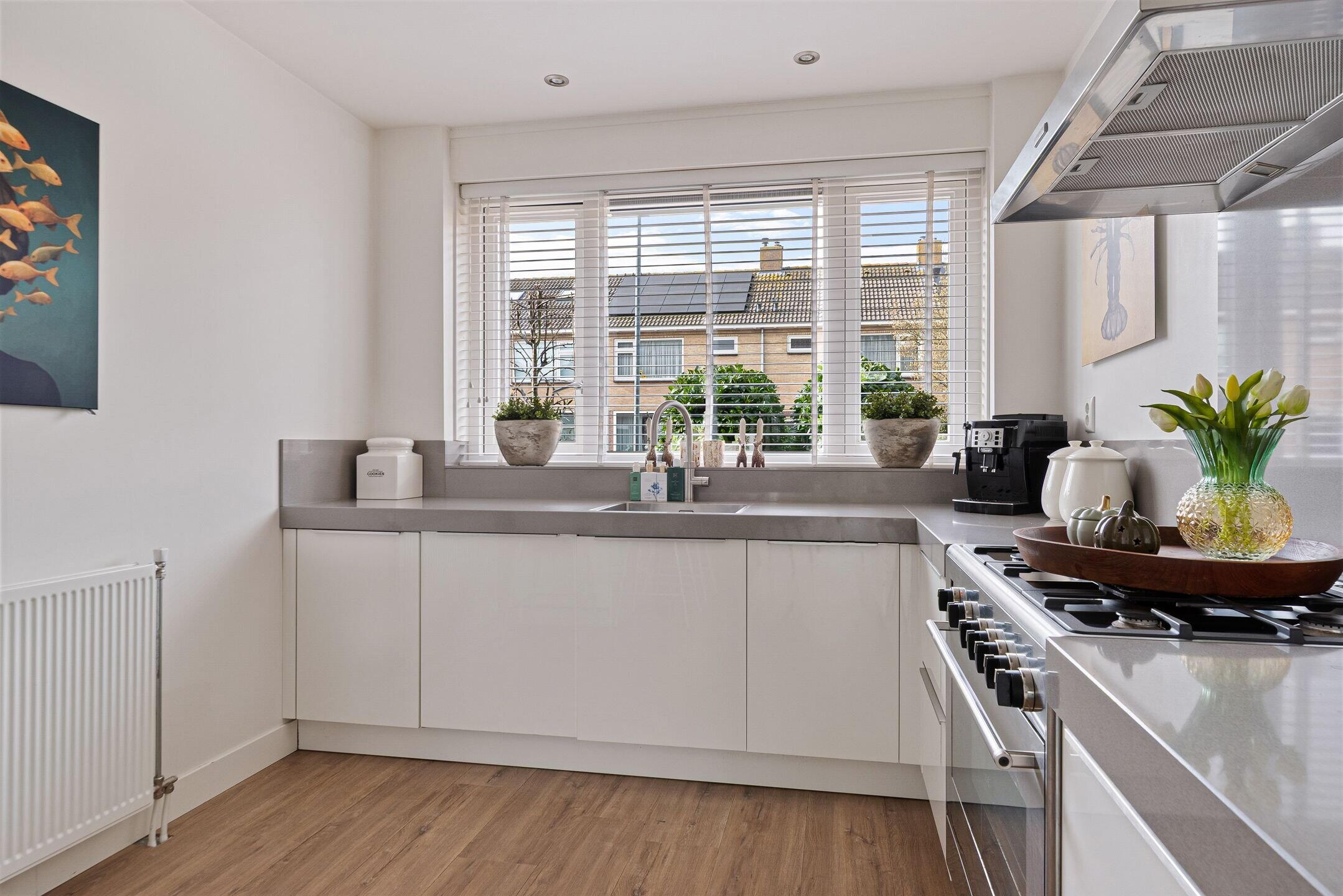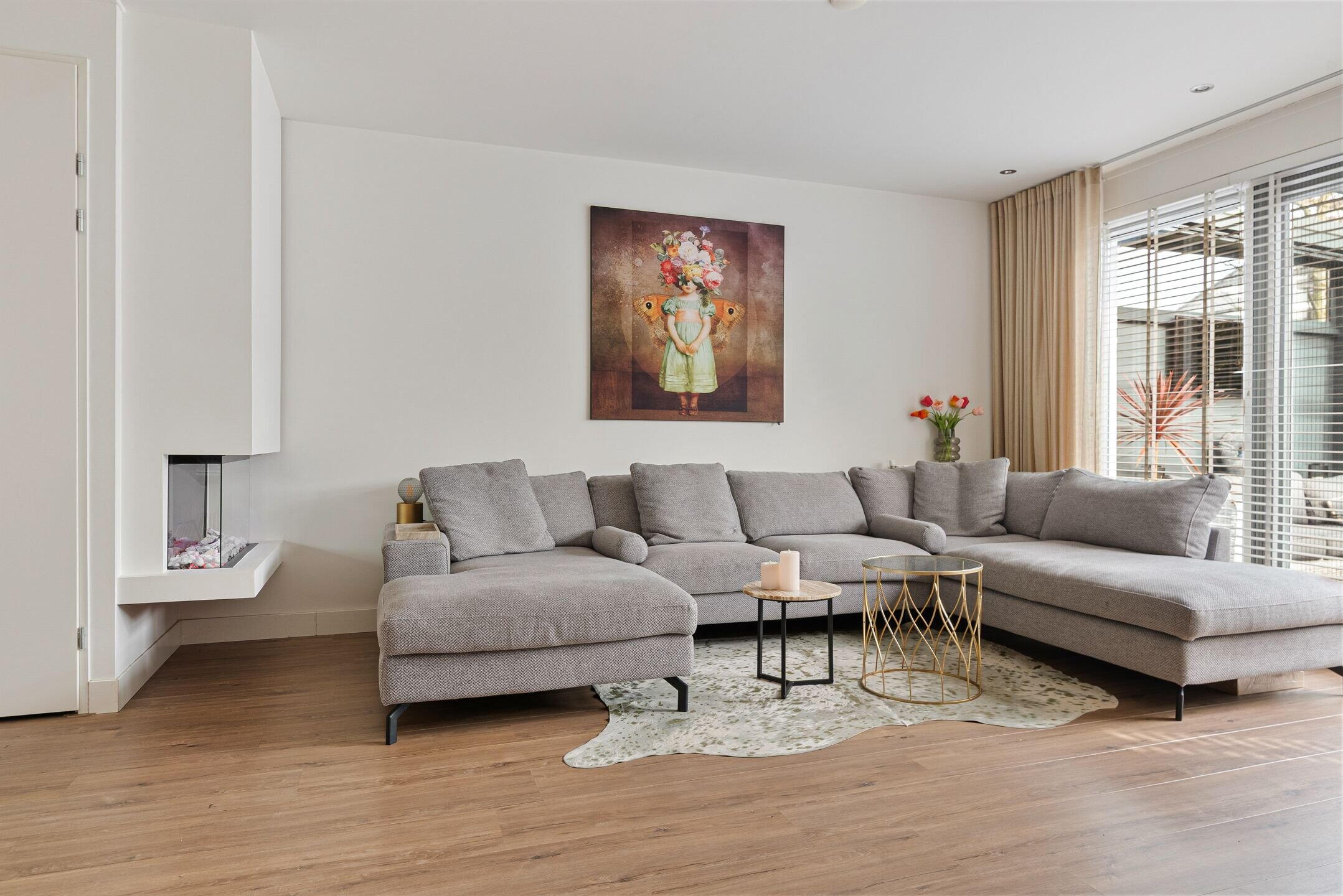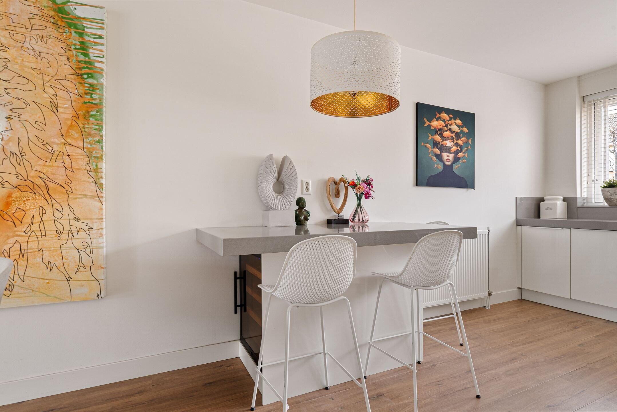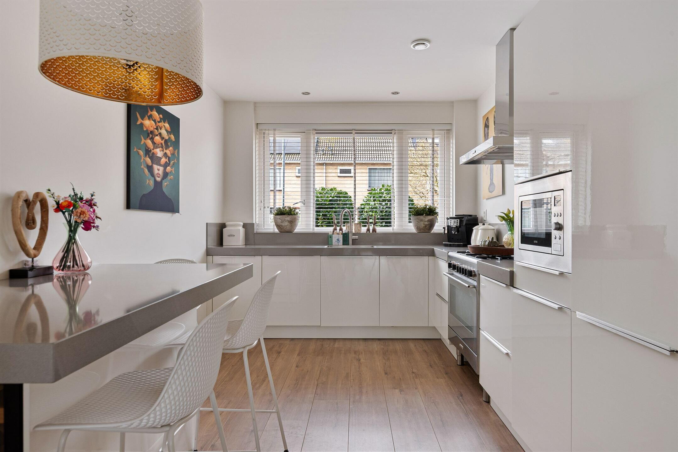 Bij binnenkomst valt direct de verzorgde en moderne afwerking op. De lichte woonkamer biedt een fijne leefruimte met een prettige verbinding naar de tuin. Grote raampartijen zorgen voor veel daglicht en een ruimtelijk gevoel. Aan de voorzijde bevindt zich de luxe keuken, compleet uitgevoerd met moderne inbouwapparatuur en volop werk- en bergruimte – een heerlijke plek voor kookliefhebbers. De begane grond is praktisch ingedeeld en vormt een fijne leefruimte voor het hele gezin.
