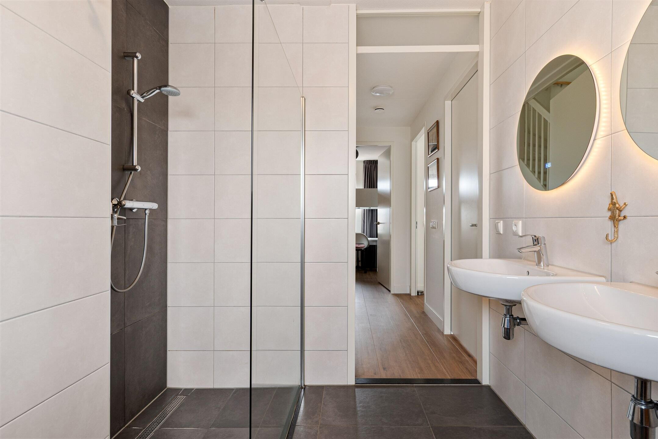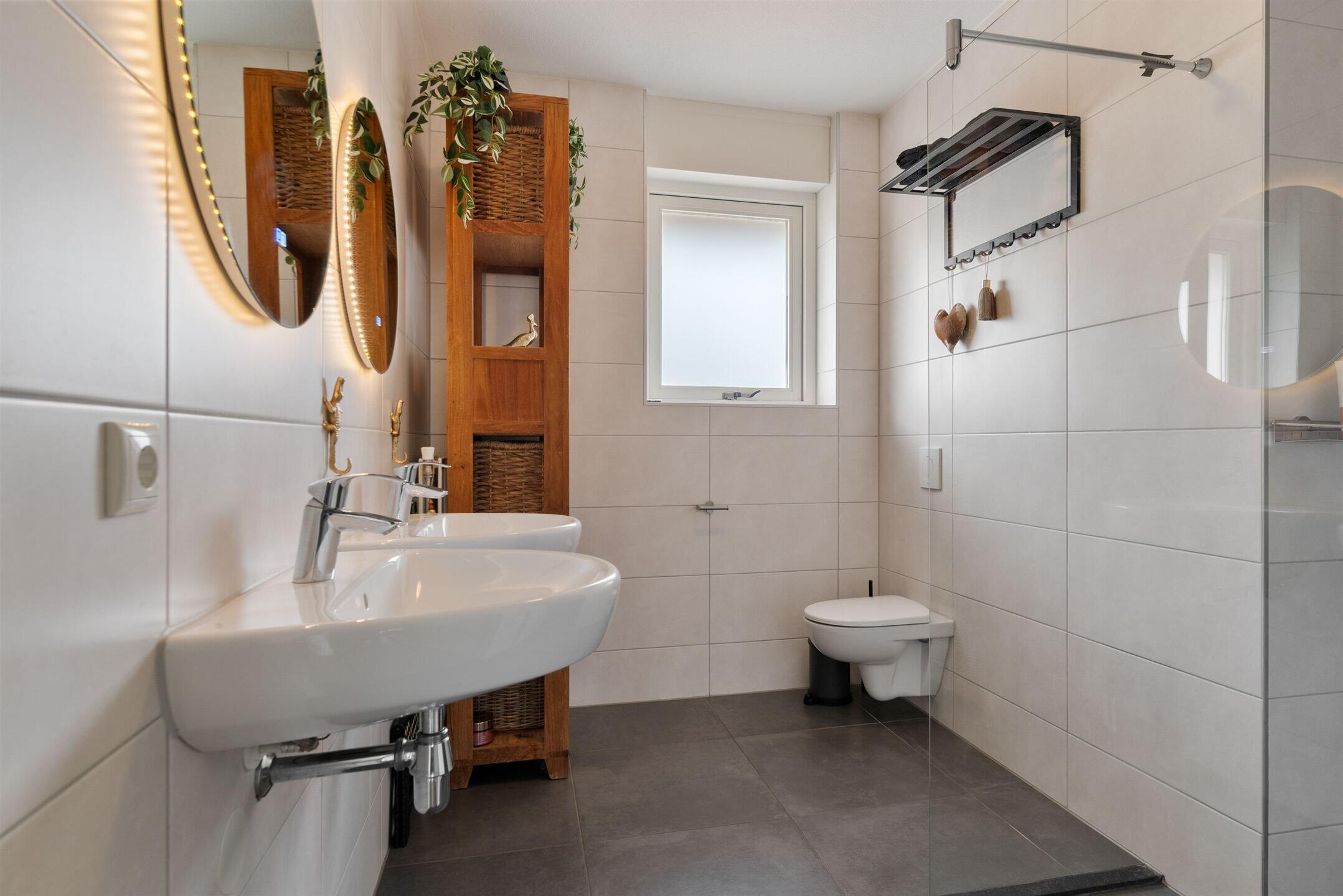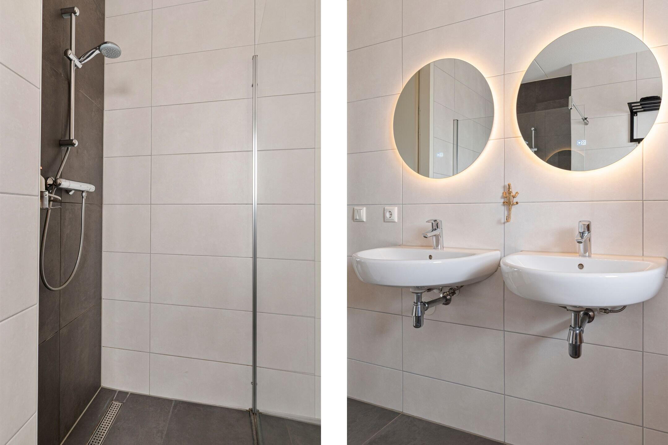 De moderne badkamer is stijlvol afgewerkt en van alle gemakken voorzien. Hier vind je onder andere een comfortabele douche, 2 wastafels en eigentijdse afwerking die zorgt voor een luxe en ontspannen sfeer.