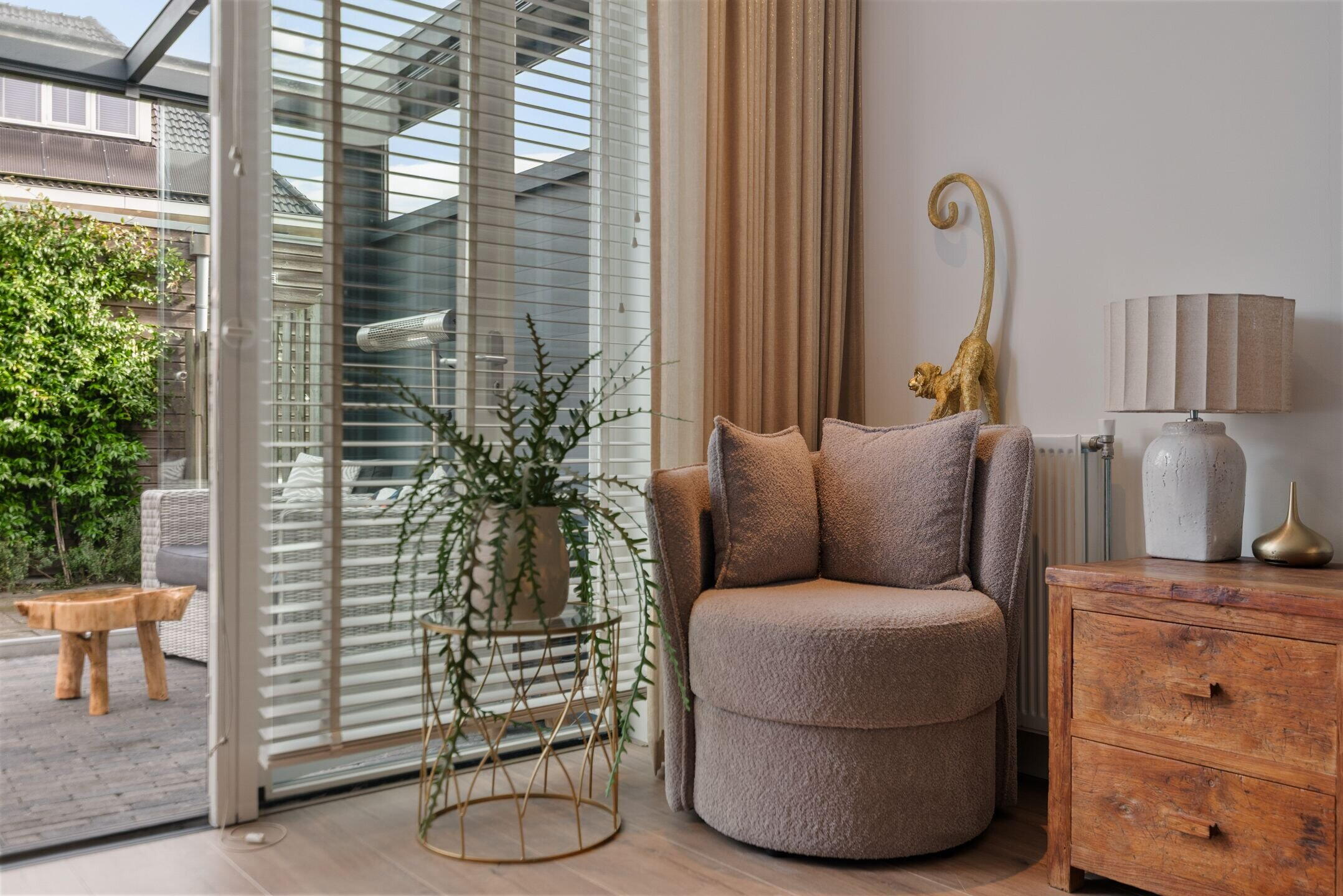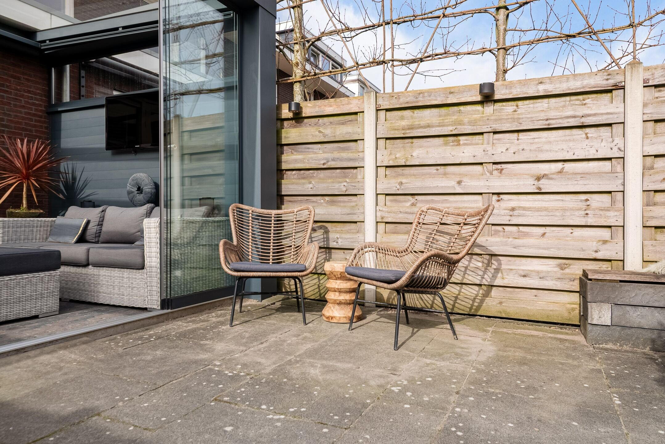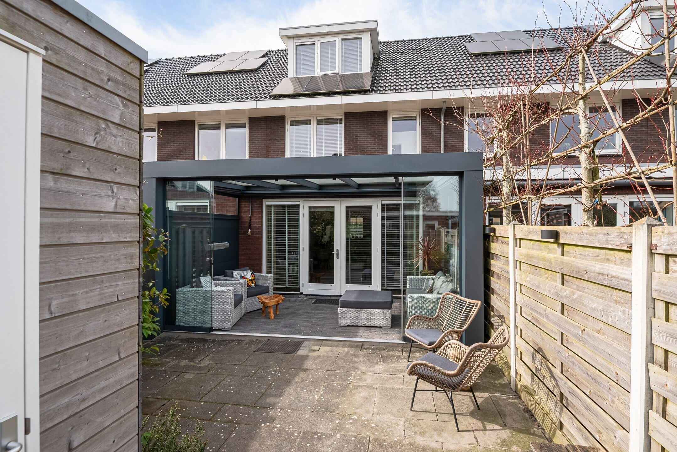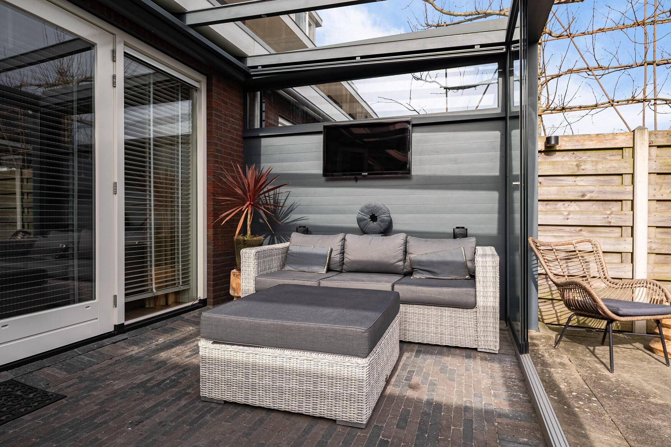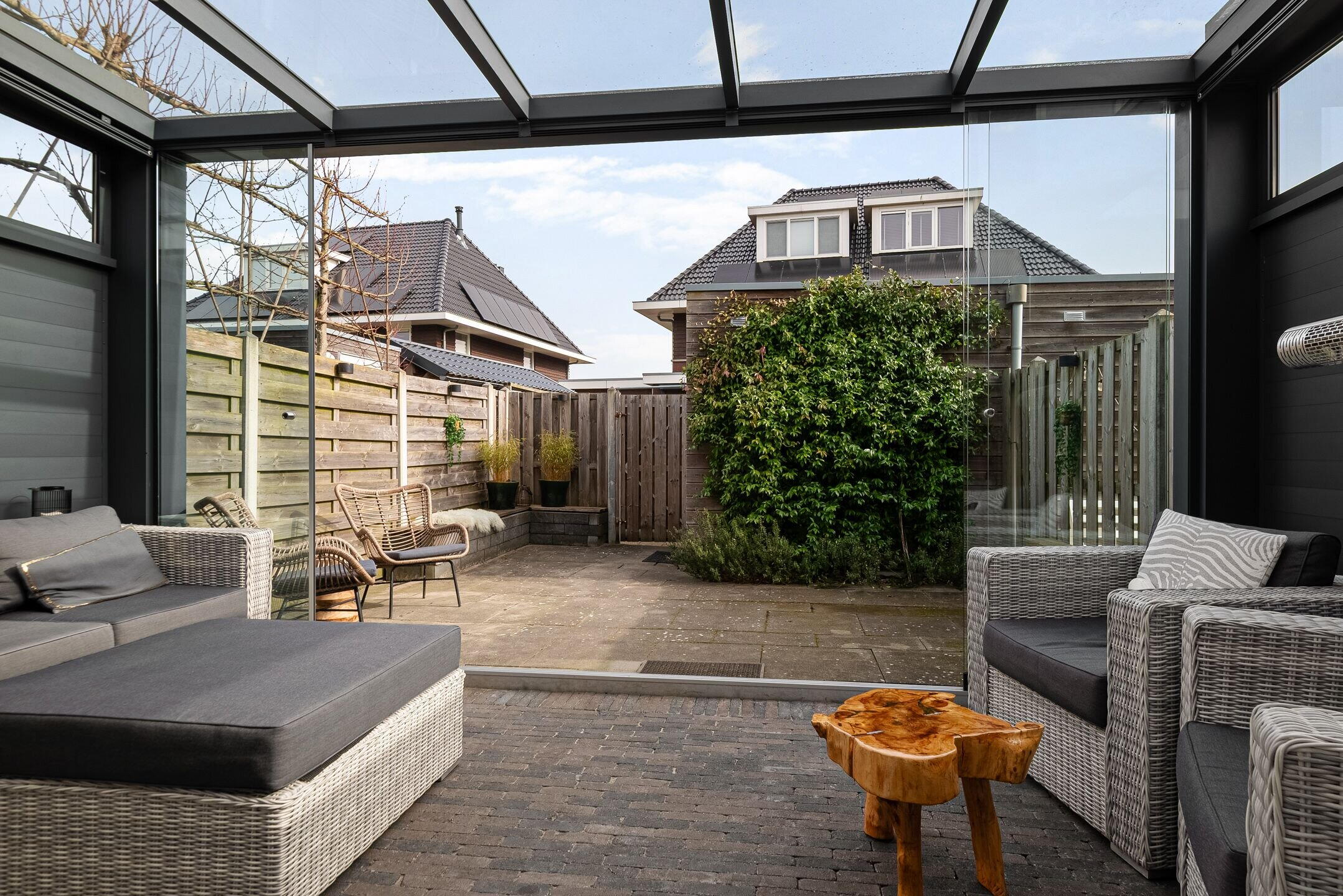 De tuin heeft een aangebouwde luxe serre, vormt een fijne verlenging van de woonkamer en biedt een heerlijke plek om te ontspannen, te spelen of gezellig buiten te eten. Dankzij de gunstige indeling is het een prettige buitenruimte waar je volop kunt genieten van rust en privacy.
